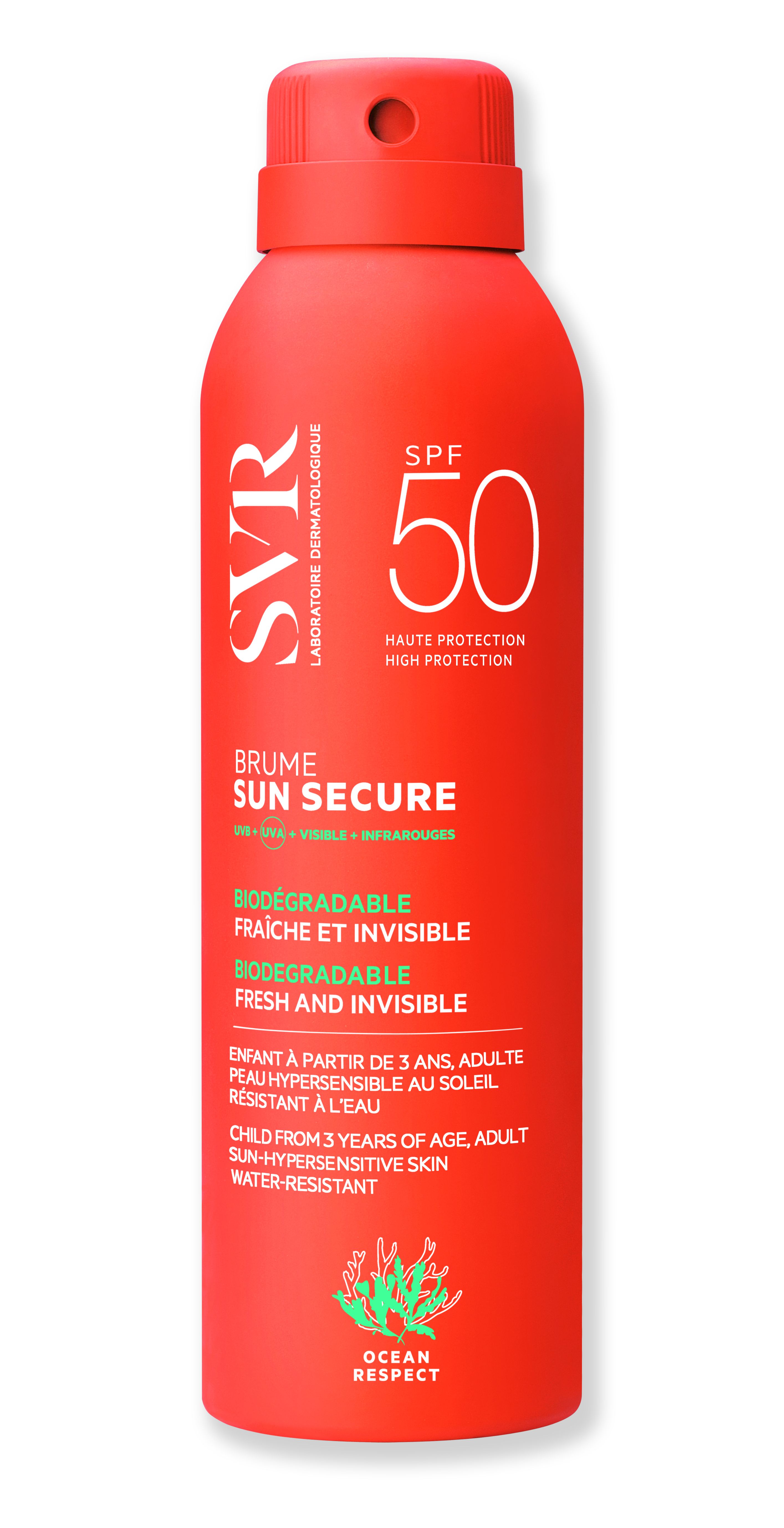 SVR SUN SECURE Brume SPF50+ Patente Sun Secure(1): 4 años de investigación para desarrollar la combinación de filtros ideal que proporciona una protección solar muy alta respetando el medio marino.